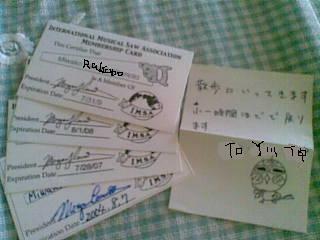 ご来場のみなさま本当にありがとうございます。 打ち上げに参加したオケメンバーにツアー中の師匠の様子を尋ねたところ 「(東京から)来るときより帰るときの方が元気やったで」 とのこと。 八十歳にしてこれからエンジンふかす気まんまんですと。 うひゃあ頼もしいなあ(笑) さて今回の新録アルバムですが、なんと「蘇州夜曲」が収録されています。 作曲家、服部良一氏がもっとも愛したといわれのあるこの楽曲 今もなお様々な歌い手にカヴァーされ 愛され歌い継がれ演奏され継がれています 元歌は渡辺はま子(&霧島昇)版や李香蘭(山口淑子)版ですが 最近だと平原綾香版とか小田和正版とかASKA版とか夏川りみ版とか・・・・数え切れないや のこぎり者としてはサキタハヂメ氏の得意曲であり 自らのこ演奏を嗜むひとたちからも 「いっぺん演ってみたい曲」ナンバーワンの人気曲。 それだけにこれを他人の前で演奏するってのは ワタシ、もう相当覚悟が要るんですよね なにしろスンゲー良い見本があるんですから そのスンゲー見本のリストにさらに追加ですか もう色々たまらんなあ(笑) だからといってただぼんやりと他人の演奏を 指くわえて羨ましがっているなんてできません ワタシもいつの日か ワタシの ワタシだけの 「蘇州夜曲」 を演奏できるようになりたいです。 最近何もこのブログに書いてなかったので穴埋めに落ちてたバトンを一つ拾わせていただきました 【歌バトン】いってみよっ! 1.小・中・高校・成人・現在(まだ成人でない方は、そこまで)と、心に残っている楽曲は?ちょっとしたエピソードなどもどうぞ♪ ☆小学生 世間の流行に疎い(そして流行しすぎているものには背を向ける)上に基本はインスト好きというイヤミな思考と嗜好の嫌なガキでした。 今もそうですスミマセン。 ということで当時は・・・・ 教科書で習った『朧月夜』 キャンプファイヤーで歌った『すいかの名産地』『燃えろよ燃えろ』 何かの子供番組で流れていた日本語版(子供向け訳)『イエローサブマリン』『オブラディオブラダ』 ちなみに幼稚園時代は歌の時間に習った『ペチカ』 渋っ! ☆中学生 ↑の状態がさらに酷くなります、もーかわいくないクソガキで(汗) 某電子オルガン教室に通っていたため当時習っていたの講師やオネエサン達の趣味のまねっこで 「アース・ウインド&ファイヤー」とか「ラモーンズ」とか「サイモン&ガーファンクル」とか「カーペンターズ」とか良くわからないけど聞いていて・・・・・中三の後半になっていきなり「さだまさし」と「アルフィー」に目覚める(爆笑) なんでやねん。 あと、ミュージカル映画音楽も好きで『私のおきにいり』(サウンドオブミュージック)とか『運がよけりゃ!』(マイフェアレデイ)『アメリカ』(ウエストサイド物語)とかうろ覚え日本語歌詞でハナウタ歌ってて気持ち悪がれてました。 ☆高校生 やはり基本はインスト好きで「スクエア」「カシオペア」「ゴンチチ」のエアチェックはかかせません。 それ以外で歌ものとなると・・・・ 「スターダスト・レビュー」「上々颱風」かなあ。 レトロ歌謡に嵌っていくきっかけですね。 【大学生~成 人】 むちゃくちゃに色んなジャンルを聞きまくっていたので何がなにやら。 「モダン・チョキチョキズ」「たま」「ビギン」「りんけんバンド」「電気グルーヴ」「サザンオールスターズ」「筋肉少女帯」「ウルフルズ」「パフィー」「ソウルフラワーユニオン」・・・・こんなかんじ あと、香港映画にも嵌ったから華流歌手や俳優の歌ものを集めはじめるのもこのころから 【現 在】 ようやっと今風の流行に追いつく(笑) 「山崎まさよし」「斉藤和義」「クレイジーケンバンド」「サンボマスター」「リップスライム」「ゴスペラーズ」「椎名林檎」「ヒトトヨウ(<漢字出てこない)」「大西ユカリと新世界」などなど そして時代に逆行しまくる 明治・大正・昭和初期の流行歌とか(服部良一作品大好き) 昭和時代の特撮の主題歌とか(爆) 2.一番最初に買ったレコードorCDは? Beatlesのベストで『赤版』とか呼ばれてるやつ 『ミッシェル』とか『エリナ・リグビー』とかしんみり系が好きでした 3.一番最近買った(ダウンロードした)シングルは? シングルはほとんど買わないけど 中古でゲットした中康介の・・・あれ、現物が手元にないや、タイトル忘れた(どかーん) 4.人生の転機で聞いた曲は? 転機ばかりですから(遠い目) これまたタイトル忘れたけど最近保育所や幼稚園で卒園時に歌ってる ♪いーままでー でああった たくさんの きみと きみと きみと きみと・・・・・ って曲がきっとこれからも何かの機会にふっと 口ずさみそうです 5.バトンタッチ!5名 勝手に拾ったものなので余所へまわすなんて(笑) 久々長文かいちゃったよ 最後まで読んでくれたみなさん おつかれっした |