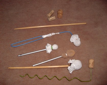 ノコにあたる部分の素材はコルク栓が手ごろです。 コルクのほかにけしごむ、スーパーボール、等が加工しやすいです。 もちろんいろんな「叩いて音が出る楽器」の撥を試すのもいいですね。 ある日の練習会でメンバーのツッチー(愛称)さんが謎の撥をもってきておりました。 カスタマイズはノコ本体でもやります。 |